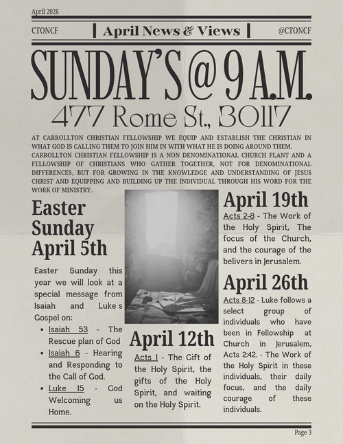 The primary format of corporate Bible study Carrollton Christian Fellowship is active in is Verse-By-Verse because of the previous two points - God's desire to impact His people through His complete Word and Revelation of Himself which culminates in and through the work and ministry of Jesus Christ.